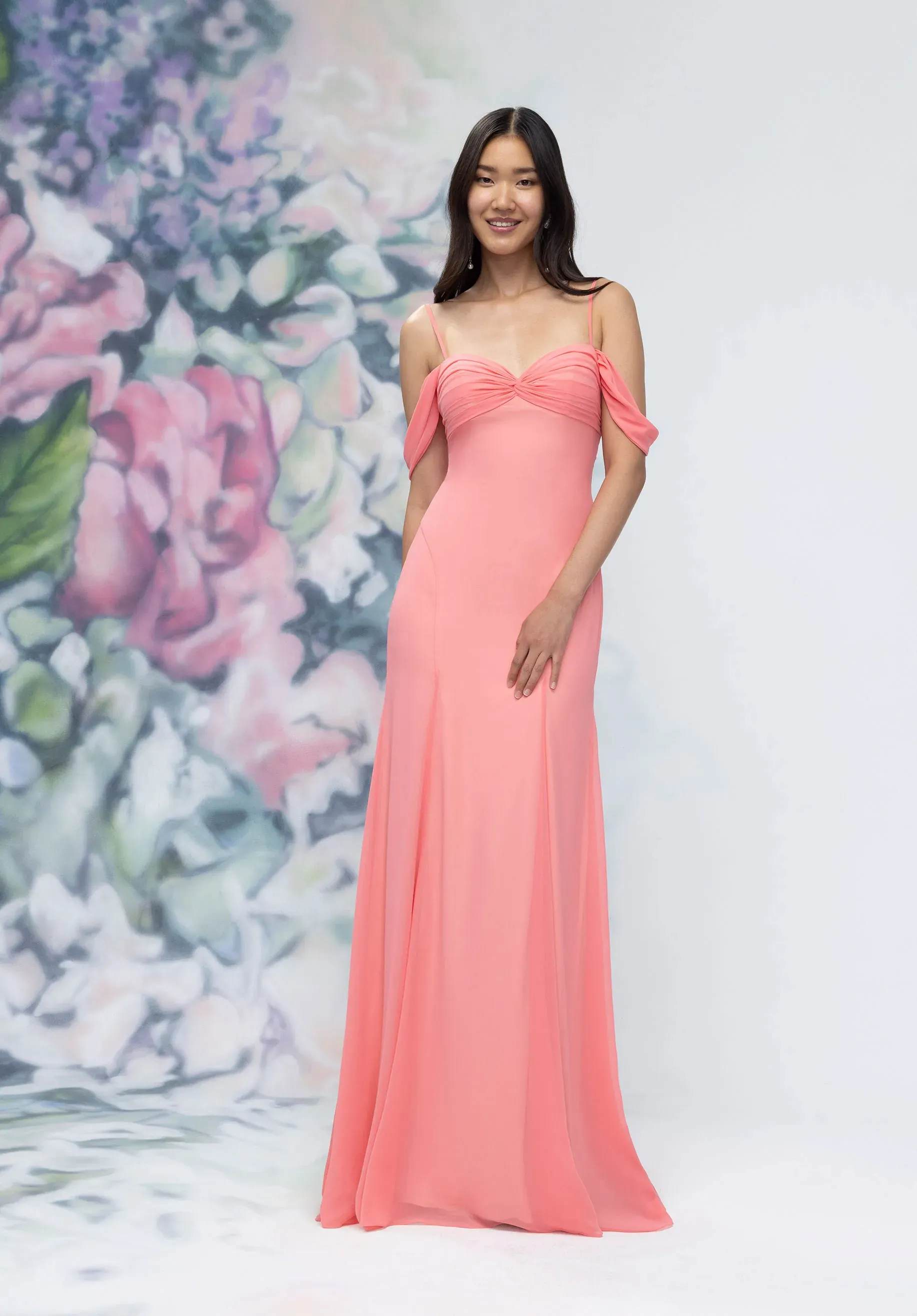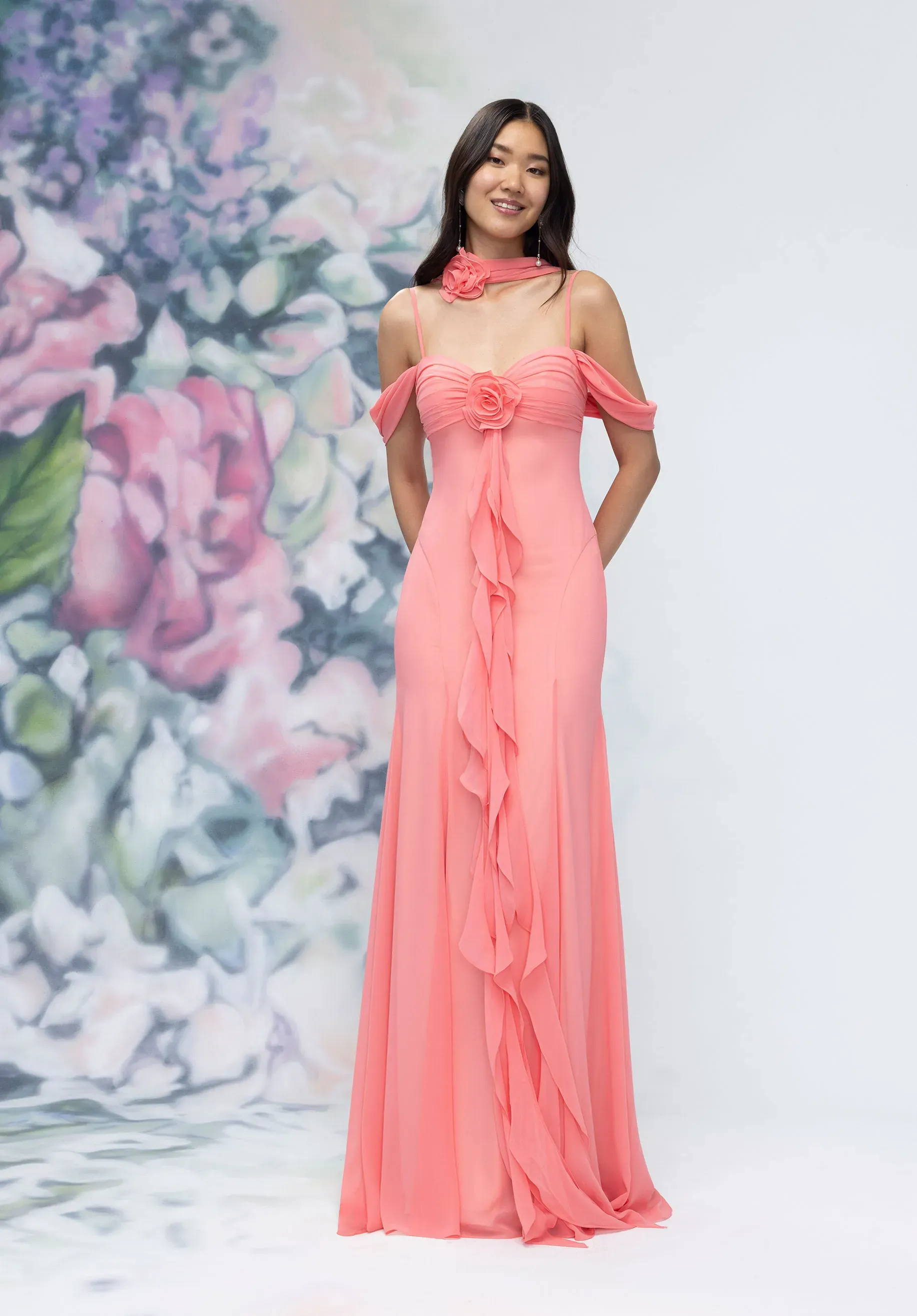 This chiffon sheath bridesmaid dress features a ruched sweetheart neckline and empire waist that flatter with soft structure. Straps and off-the-shoulder sleeves add a romantic silhouette, while contoured seaming creates a beautifully sculpted fit. A detachable cascading floral ruffle and matching floral neck scarf offer versatile styling moments, perfect for making a statement that’s equal parts modern and poetic.