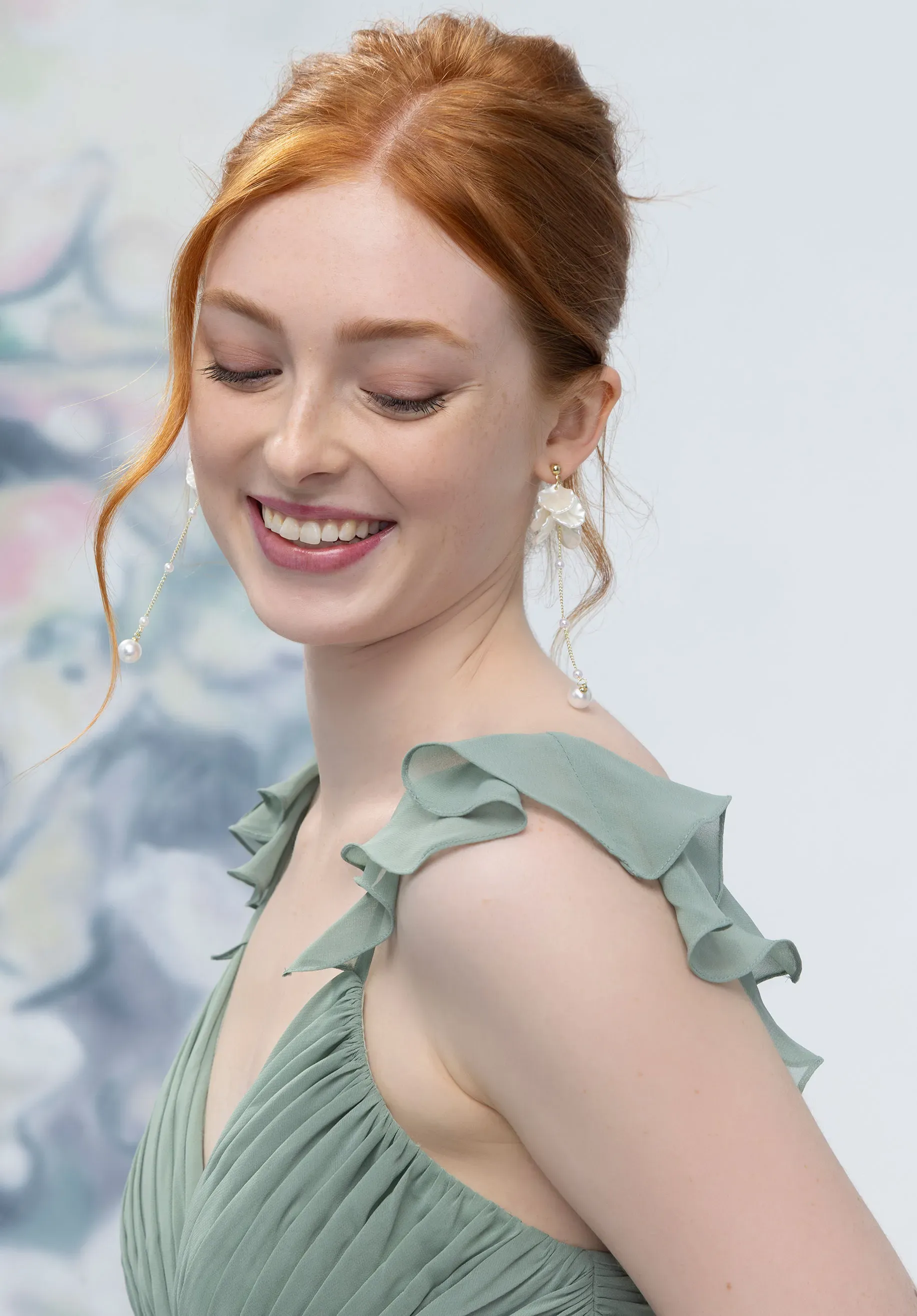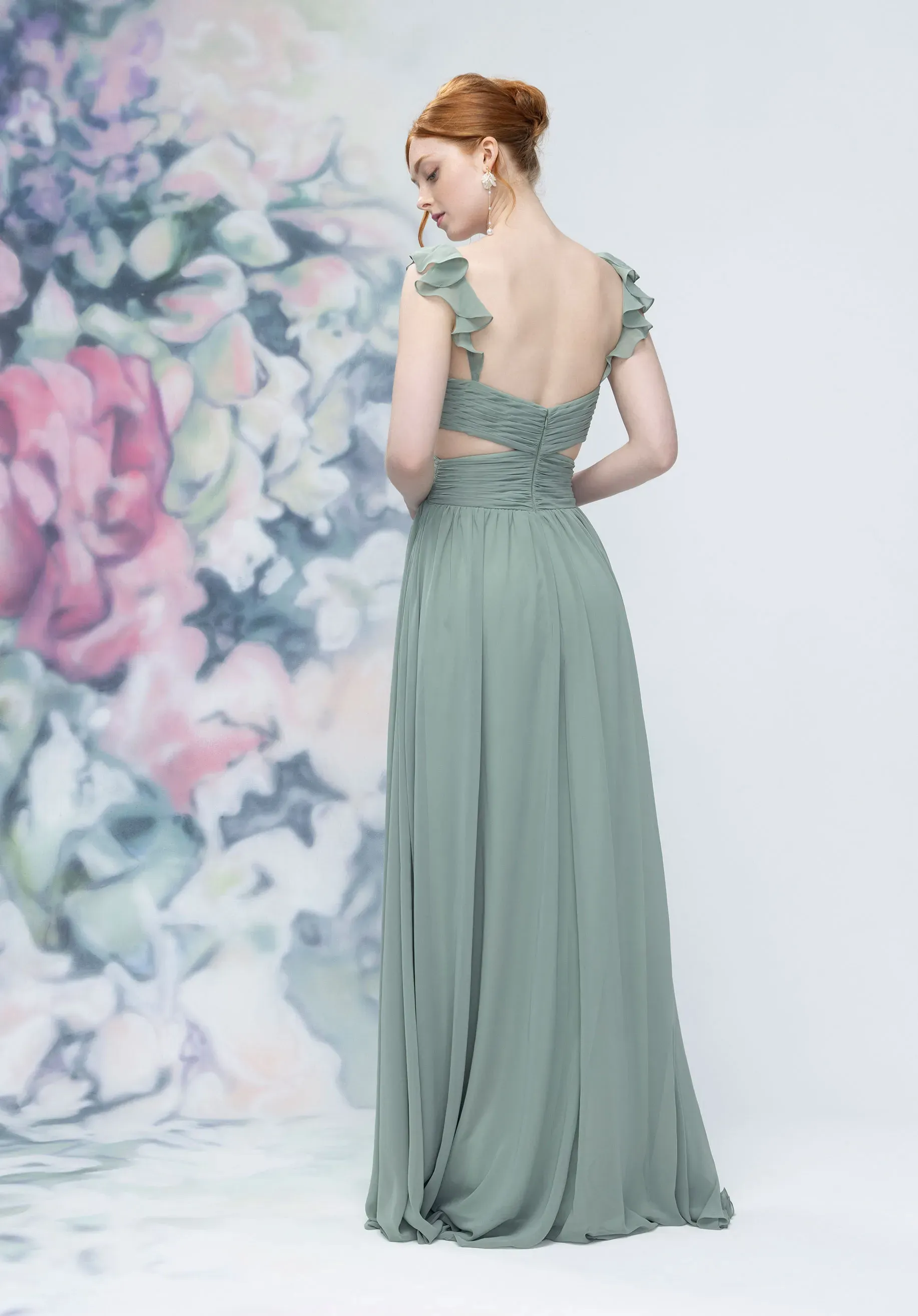 This chiffon A-line bridesmaid dress features a classic v-neckline on textured ruched bodice with a crisscrossing design that sculpts the figure. Delicate side cutouts and flutter sleeves add unexpected detail and movement, creating a contemporary silhouette that’s both elegant and effortlessly chic.