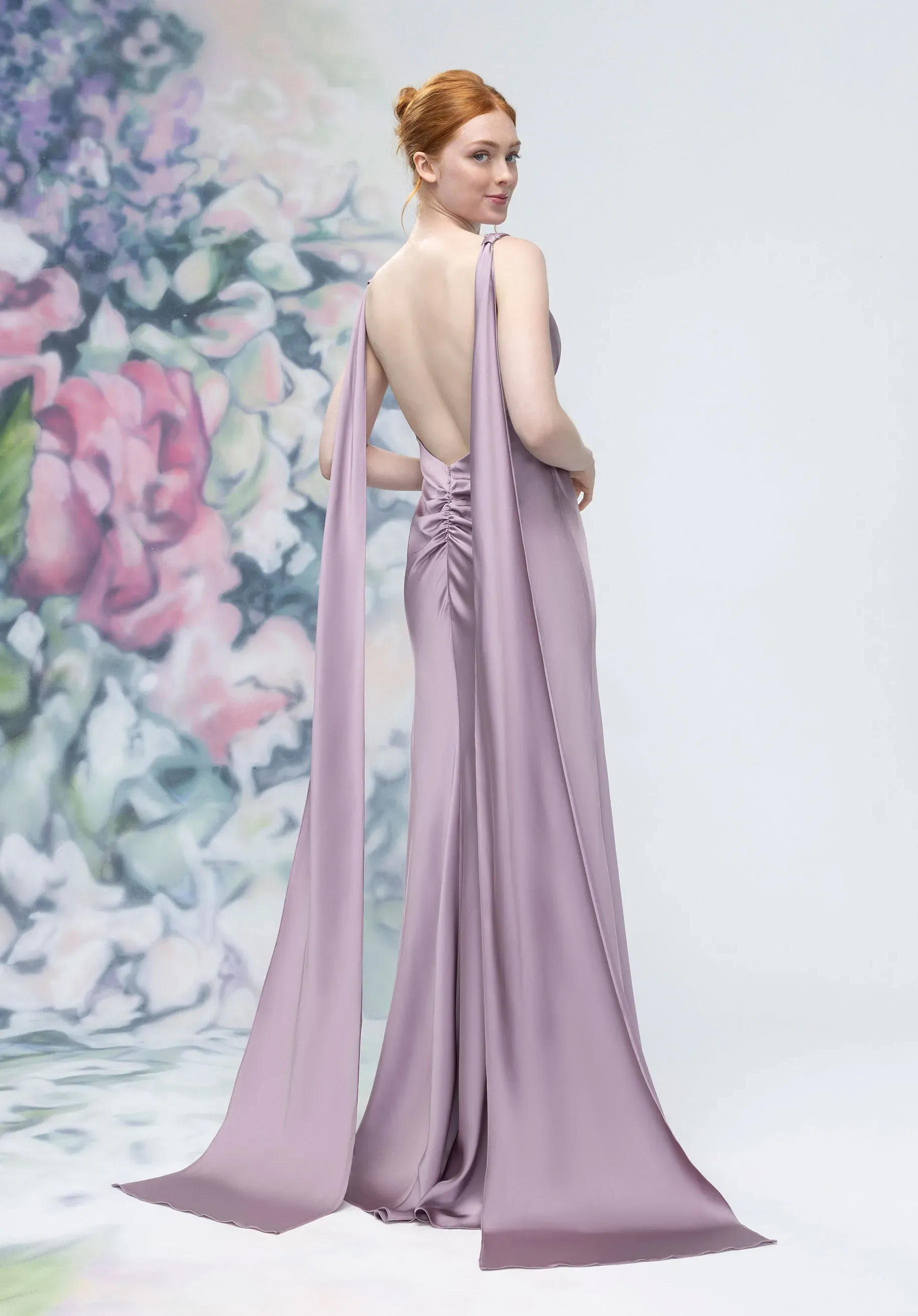 This luxe satin gown features a flattering V-neckline, ruched bust, and defined empire waist that enhances the silhouette with subtle structure. An open back low back adds a sultry appeal with ruched detail for a flattering fit. The coordinating neck scarf elevates the look for added drama.