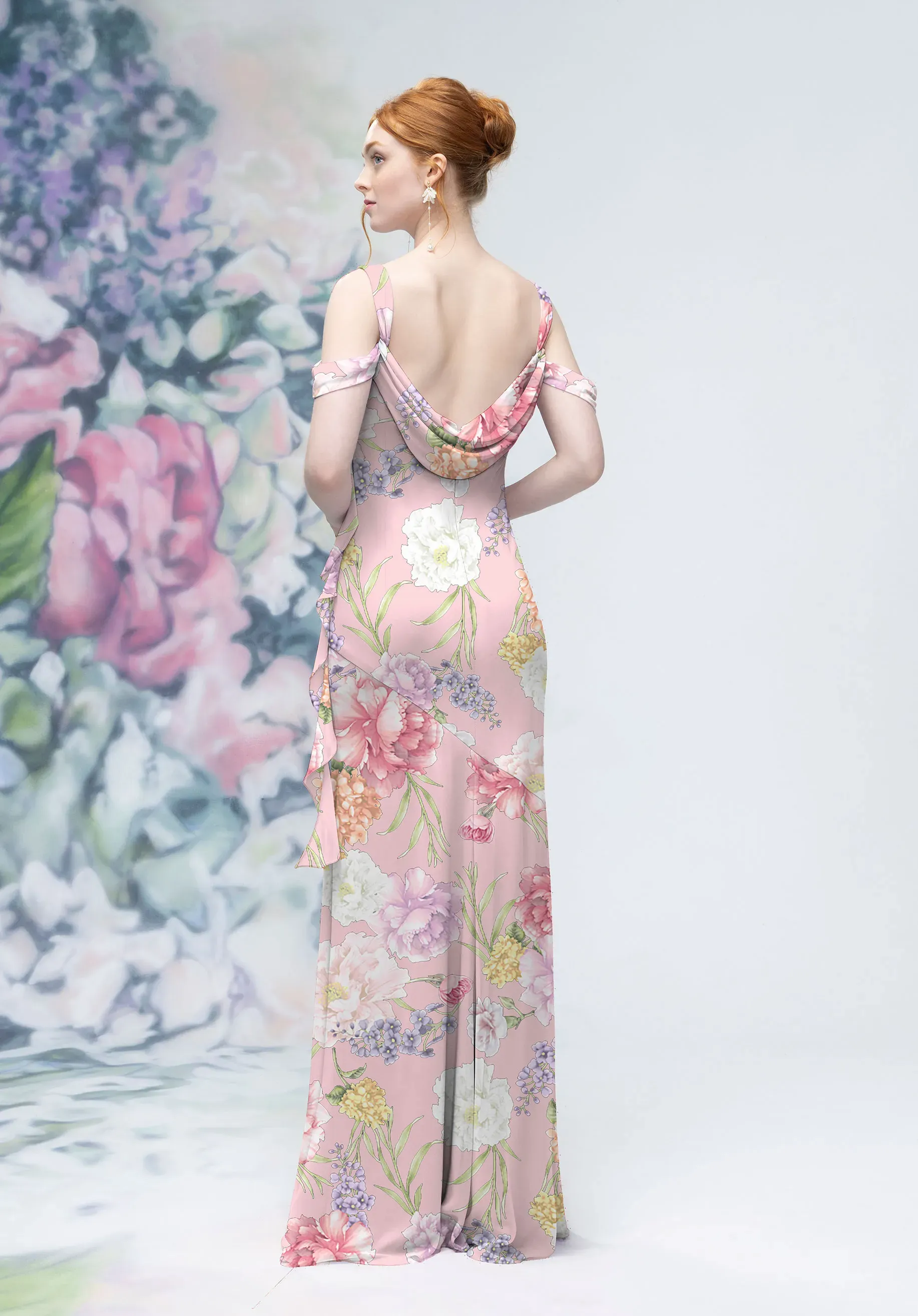 This bias-cut bridesmaid dress features a soft scoop neckline with a delicate cowl detail and a draped cowl back that falls effortlessly. Cold-shoulder straps are accented by cascading ruffle bows, adding a romantic, airy finish. Designed in floral printed chiffon, it's a modern ethereal gown with graceful movement.